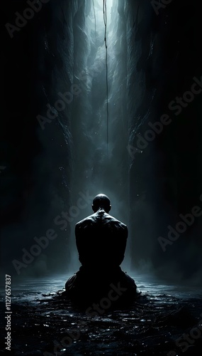 © Michael, Obraz premium Silhouette of a man sitting in a cave at night.