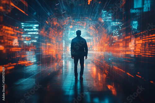 © KeransPixel, Fototapeta premium Silhouette of a man stepping into a holographic interface