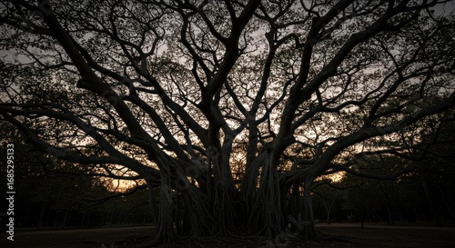 © Telrkmark, Fototapeta premium Silhouette of a massive fig tree at sunset, intricate branches reaching towards the sky.