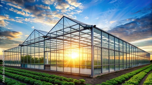 Obraz premium Silhouette of a modern greenhouse at sunset