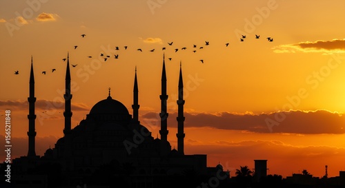 © Efendi, Fototapeta premium Silhouette of a Mosque with Flying Birds Against a Sunset Sky