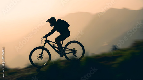 Naklejka premium Silhouette of a mountain biker riding downhill against golden, hazy sunset or...