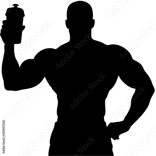 Naklejka premium Silhouette of a muscular man holding a protein shaker, showcasing fitness and nutrition concept