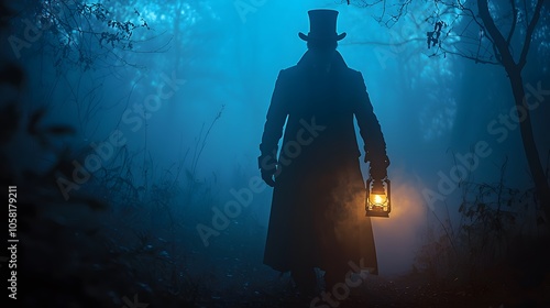 Fototapeta premium Silhouette of a mysterious figure with a lantern in a foggy forest.