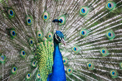 © PhotoHunter, Fototapeta premium Silhouette of a peacock with an open tail. Close up shot.