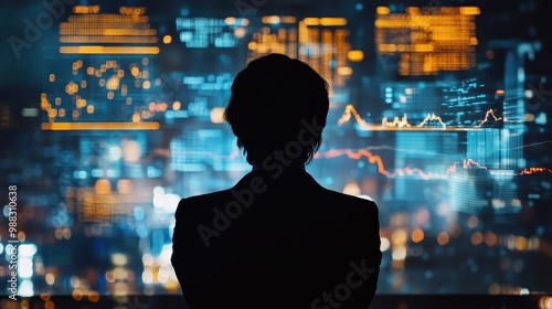 © JH45, Fototapeta premium Silhouette of a Person Overlooking a Futuristic City Skyline