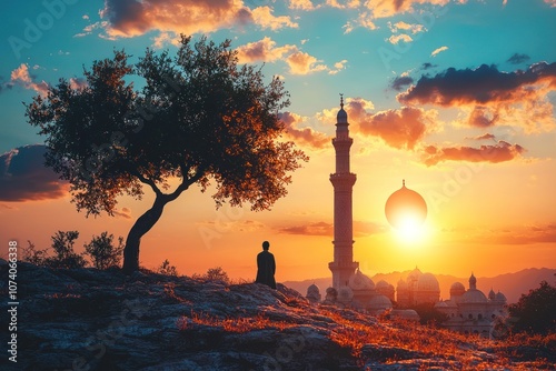 © upnowgraphics, Fototapeta premium Silhouette of a Person Standing Against a Sunset with a Mosque in the Background