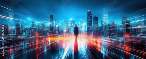 © mobile, Obraz premium Silhouette of a person standing amidst a futuristic cityscape with vibrant blue and orange light trails converging towards the center, evoking a sense of speed and technological advancement