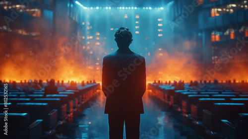 Fototapeta premium silhouette of a person standing amidst glowing lights and dark atmosphere