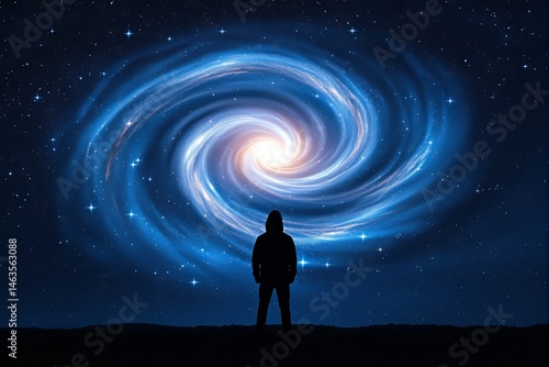 Fototapeta premium Silhouette of a person standing under a glowing spiral galaxy, creative...