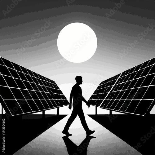 Obraz premium Silhouette of a Person Walking Between Solar Panels Under a Bright Sun Representing Clean Energy and Sustainable Future in a Black and White Illustration