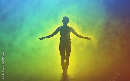 © AhmadTriwahyuutomo, Naklejka premium Silhouette of a Person with Glowing Aura Representing Holistic Health and Wellbeing, Set Against a Green to Blue Gradient Background