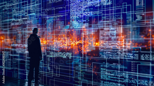 Fototapeta premium Silhouette of a Programmer Analyzing Code on Digital Screen in Futuristic Setting at Night for Success in Technology