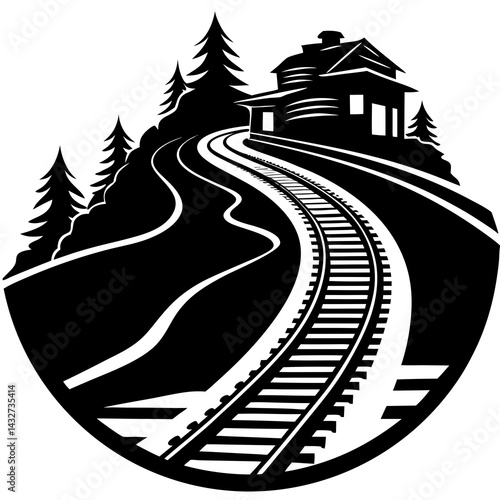 © Lamiya, Fototapeta premium Silhouette of a railway track curving around a hill with a train approaching