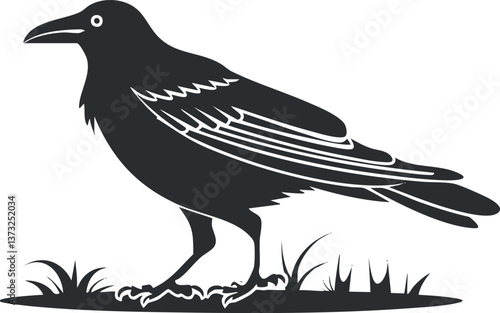 © vadymstock, Naklejka premium Silhouette of a raven standing on grass, showcasing its distinctive features in a simple design.