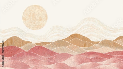 © Keattipoom, Obraz premium Silhouette of a Simple Planet with Textured Hills and Sun Design in Neutral Tones for Vector Illustration Purposes