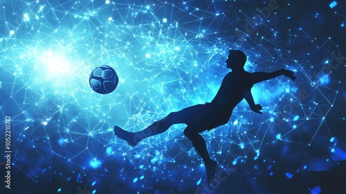 Fototapeta premium Silhouette of a soccer player kicking a ball in a blue and white abstract...