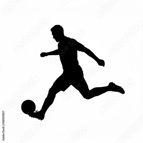 © HASSAN, Naklejka premium Silhouette of a soccer player kicking a soccer ball with his right foot in a dynamic action shot pose created with generative ai