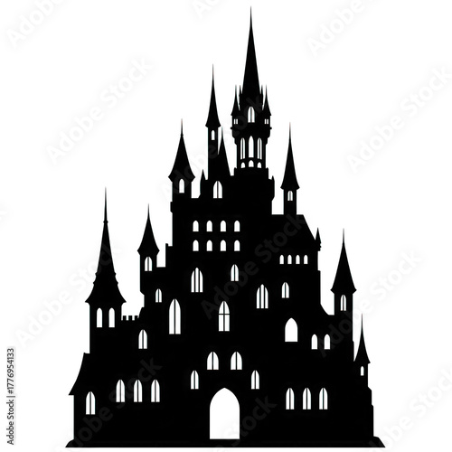 © WOW, Obraz premium Silhouette of a spooky haunted castle against a dark black night background on white background