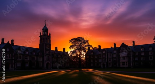 Fototapeta premium Silhouette of a stately building with a central tower against a vibrant...
