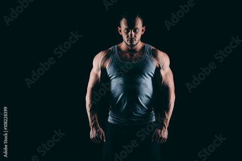 © satyrenko, Naklejka premium Silhouette of a strong fighter. Confident young fitness man with hands and clenched fists. Dramatic light.