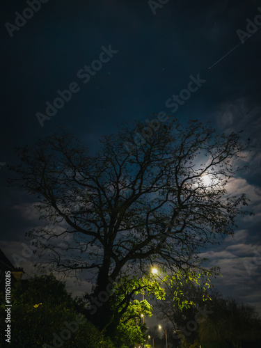 Fototapeta premium Silhouette of a Tree Under Moonlit Night Sky with Streetlights and Subtle...