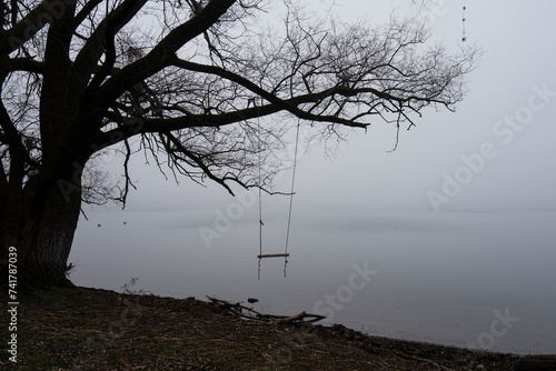 Fototapeta premium Silhouette of a tree with swing with misty foggy view onto a lake
