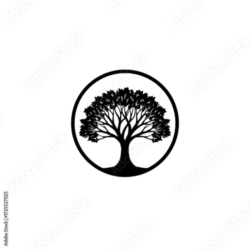 © irawan, Naklejka premium Silhouette of a tree with wide branches in a circular frame, black on white, logo design.