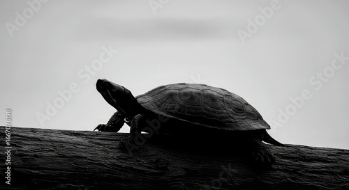 © qazi, Fototapeta premium Silhouette of a turtle on a log.