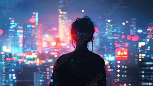 © Jiraporn, Fototapeta premium Silhouette of a woman against a vibrant city skyline, showcasing colorful lights and an urban atmosphere at night.