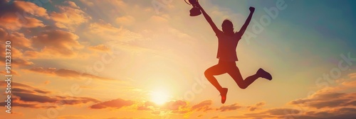 © Iswanto, Naklejka premium Silhouette of a Woman Jumping with Trophy in Sunset Sky.