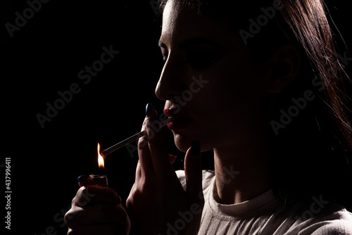 Obraz premium Silhouette of a woman lighting up a cigarette