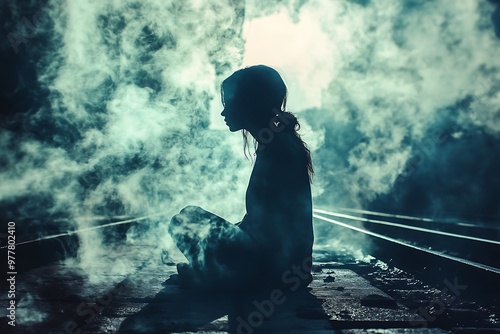 © atar, Obraz premium Silhouette of a Woman Sitting on Train Tracks Surrounded by Smoke