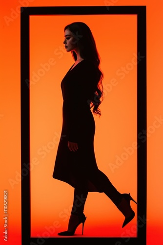 Fototapeta premium Silhouette of a woman walking against a vivid orange background