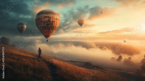 Naklejka premium Silhouette of a woman watching hot air balloons flying over a vast landscape...