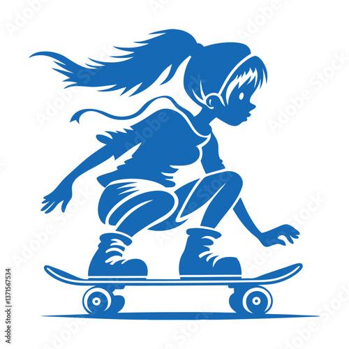 Fototapeta premium Silhouette of a Young Girl Skateboarding – Blue Vector Illustration