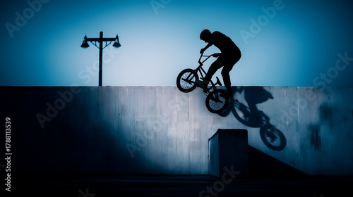 © Alesia, Fototapeta premium Silhouette of a young man performing a BMX trick on a ramp. The scene is set against a blue background with a streetlight in the distance.