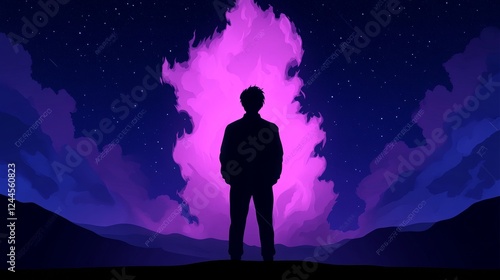 Fototapeta premium Silhouette of a young man standing before a vibrant purple and blue night...