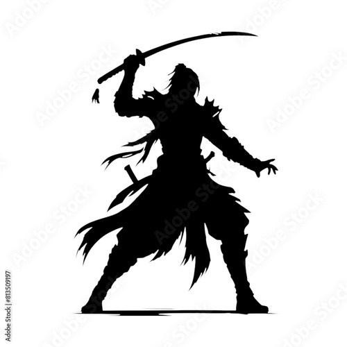 Fototapeta premium Silhouette of an Asian warrior wearing an ancient warrior's uniform, drawing...