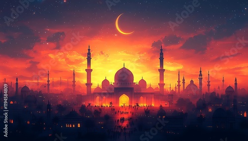© A to Z, Fototapeta premium Silhouette of an Islamic Arab city. Middle east. Religious monuments and minarets with domes. Sunset view. 3d render.