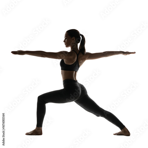 © GraphicGrove, Obraz premium Silhouette of athletic woman in warrior two pose practicing yoga and wellness under low key lighting