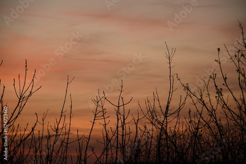 © Svetlana, Obraz premium Silhouette of bare branches against a colorful sunset sky, creating a serene and peaceful atmosphere.