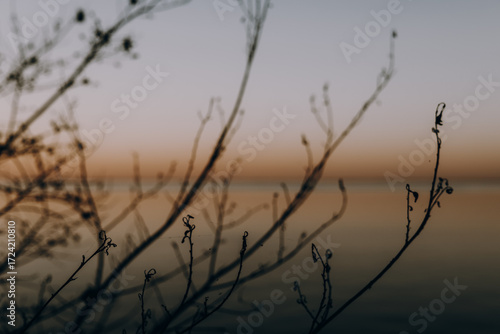 © vita, Obraz premium Silhouette of bare tree branches against a colorful sunset sky. A captivating view of tree branches silhouetted against a warm, colorful sunset. The branches create a striking contrast.