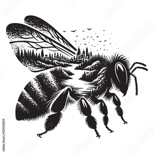 © orion, Obraz premium silhouette of Bee, filled with river view in rough drawing,