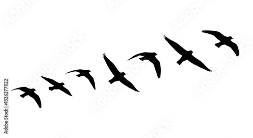 © RAJDATTA, Obraz premium Silhouette of birds flying in formation against a white background for design