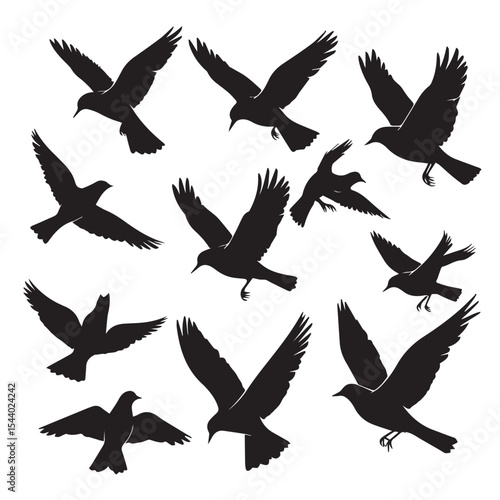 Fototapeta premium Silhouette of Birds Flying Together in Various Poses on a White Background