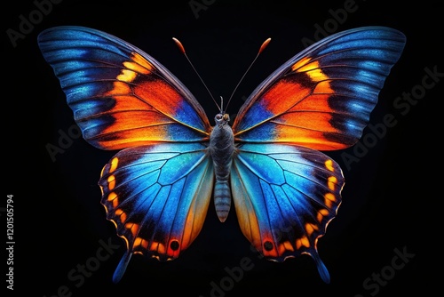 Fototapeta premium Silhouette of Blue and Orange Butterfly on Black Background - Stock Photo