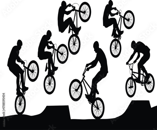 © RASID, Fototapeta premium Silhouette of bmx riders performing stunts on ramps and ledges a showcase of balance, skill, and extreme sports action