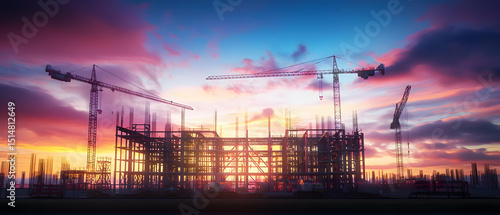 © Arda, Fototapeta premium Silhouette Of Building Under Construction At Sunset