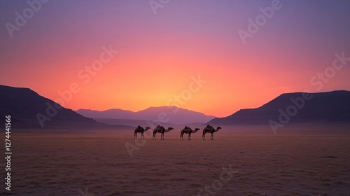 © Alexey, Obraz premium Silhouette of camel caravan crossing desert at sunset with mountains in background. Desert safari tourism view with orange and purple sky. Desert transportation scene with copy space